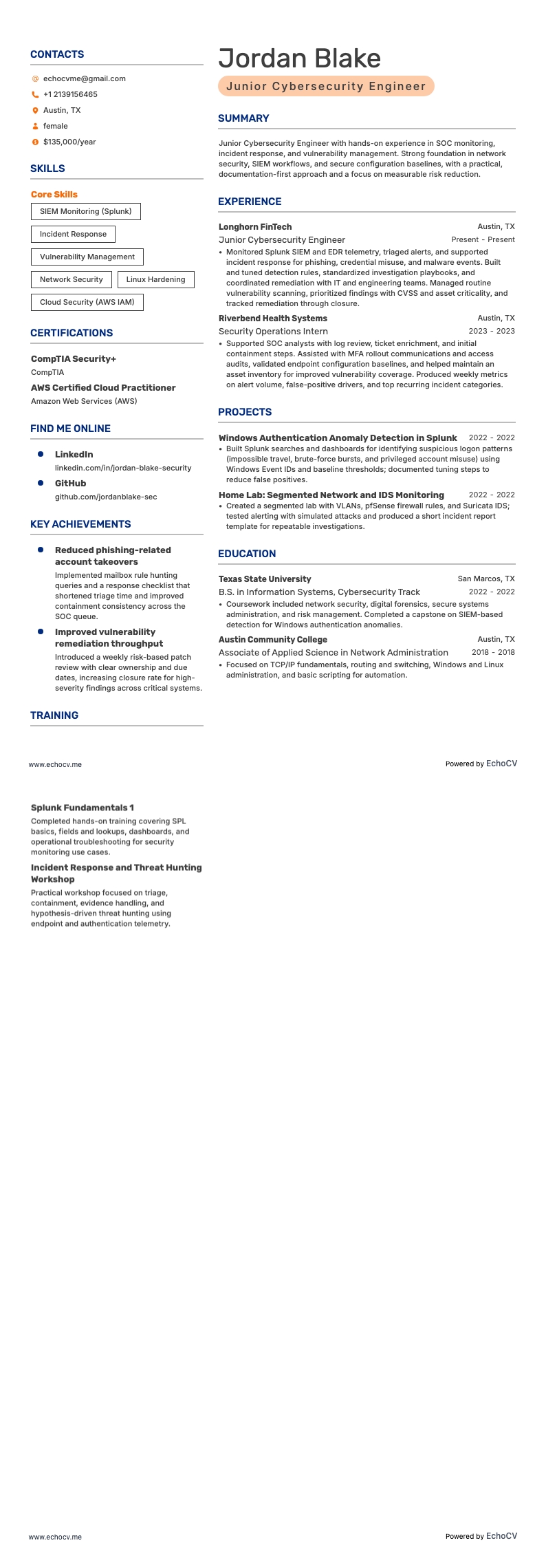Mettez en avant votre formation, vos certifications et vos connaissances pratiques grâce à un exemple de CV éprouvé pour les soins infirmiers, la santé et le bien-être. Nous nous chargeons du design et de la mise en page, afin que vous puissiez vous concentrer sur votre contenu.