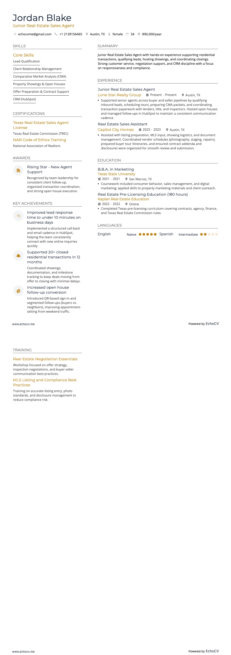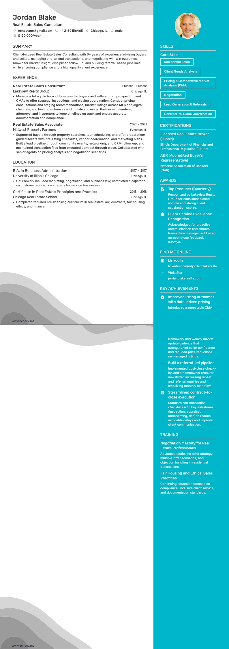 This guide shows you how to write a resume that leads with outcomes and credibility. You'll highlight closed volume, units sold, average days on market, list-to-sale price ratio, pipeline growth, referral rate, and retention. You'll show territory coverage, luxury or investor focus, and repeatable wins.