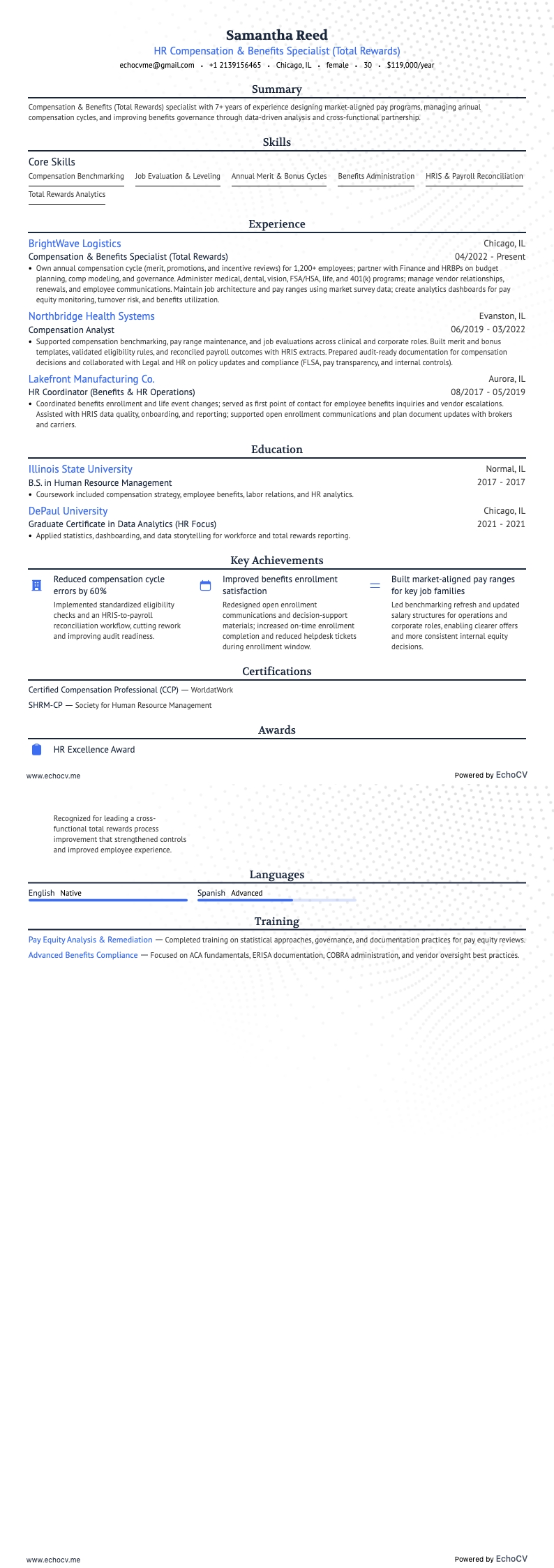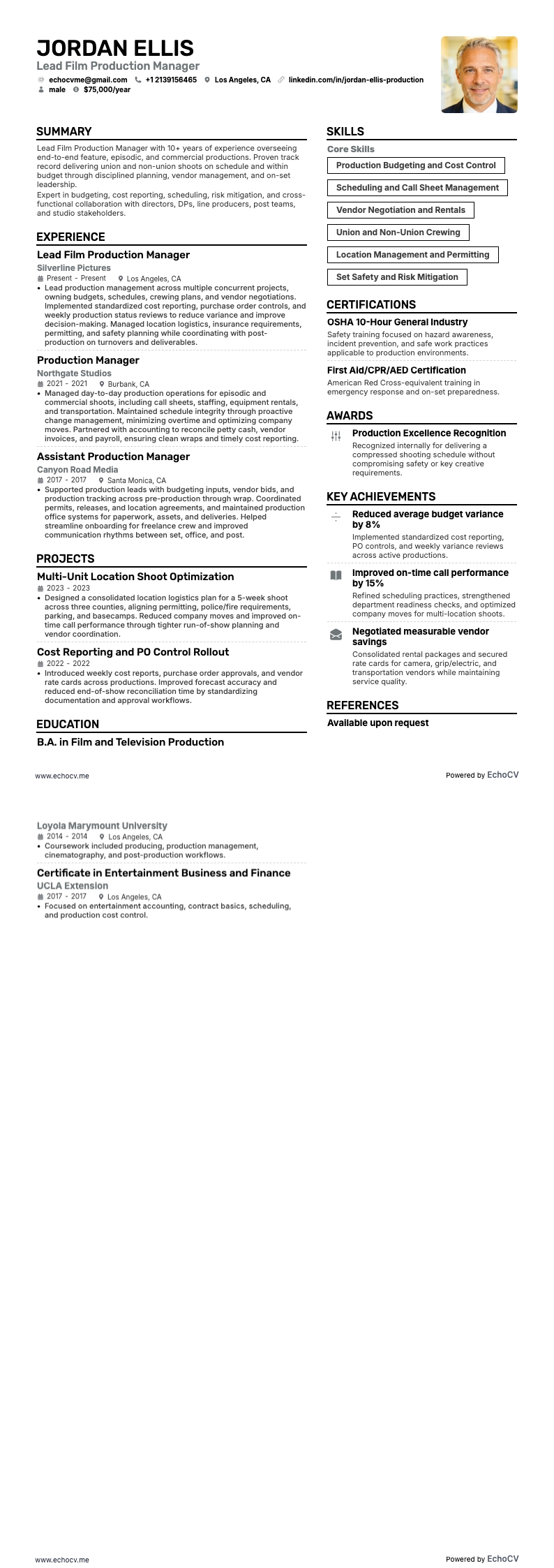 EchoCV는 과거 경력뿐 아니라 앞으로 지원할 직무에 맞게 이력서를 맞춤화할 수 있도록 돕습니다. 깔끔한 ATS 친화 템플릿으로 전환 가능한 역량과 측정 가능한 성과를 강조하세요.