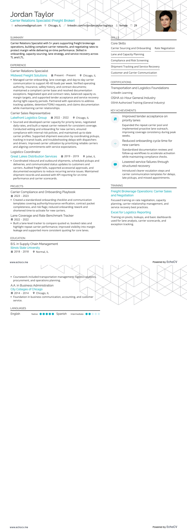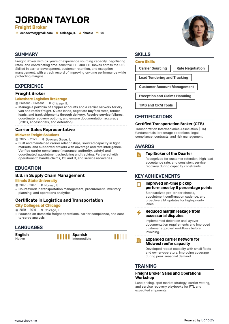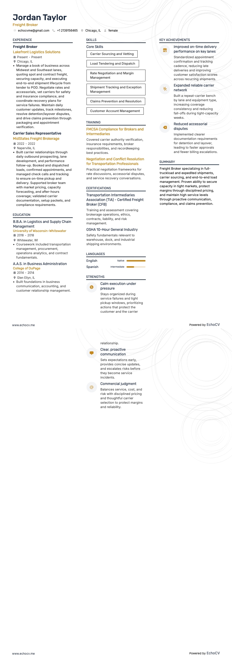 Recruiters expect you to present freight brokerage results, customer ownership, and carrier network performance in a clean, easy-to-scan resume.