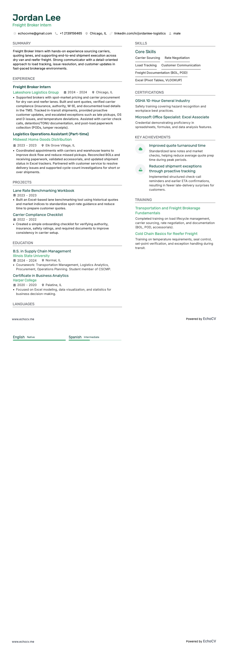 • Include projects, internships, or transitional experience in logistics, supply chain, or sales that demonstrate your understanding of brokerage operations.