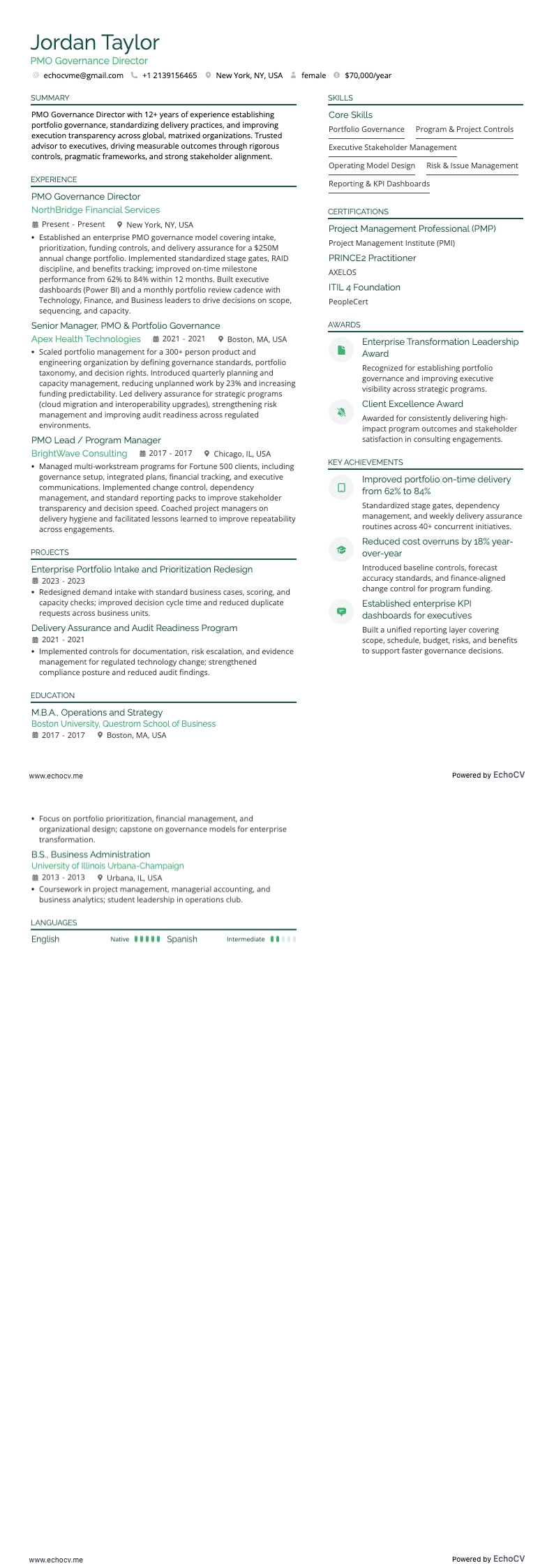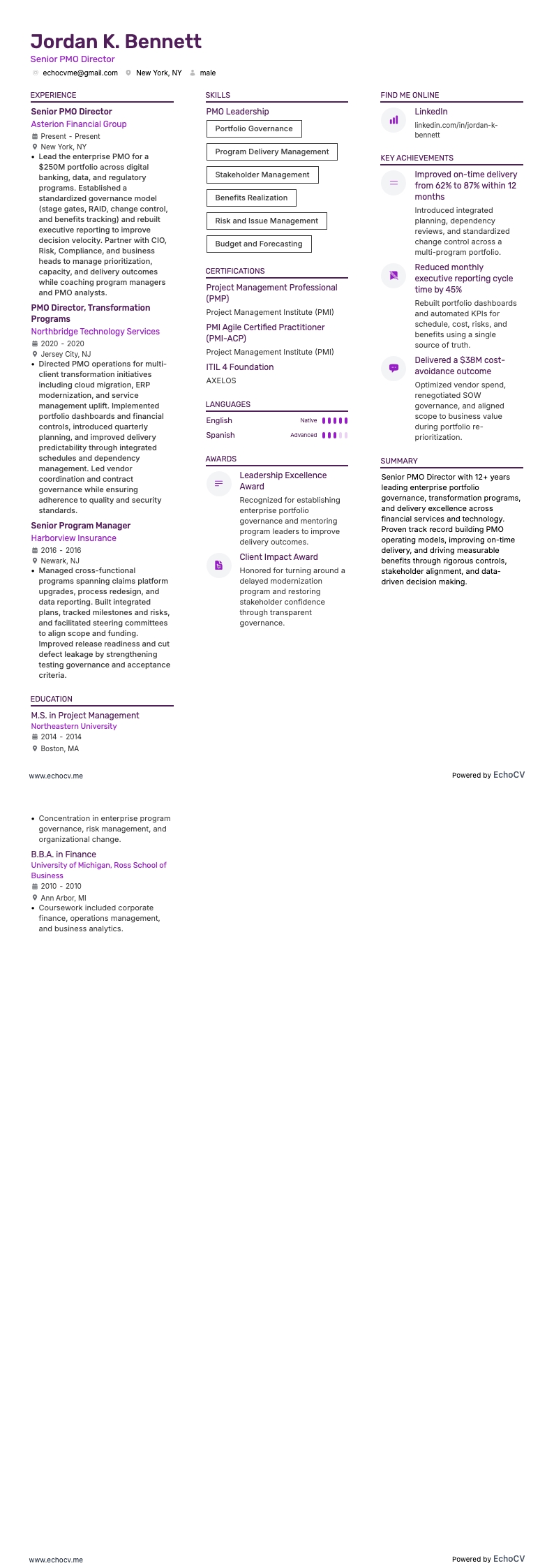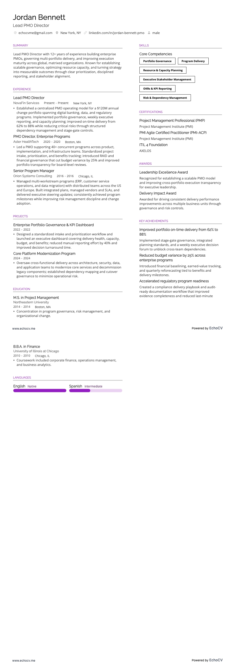 Example bullet: "Stood up an enterprise PMO governing a $140M portfolio of 60+ concurrent programs, improving on-time delivery from 64% to 91% within 18 months while reducing project overhead costs by 22%."